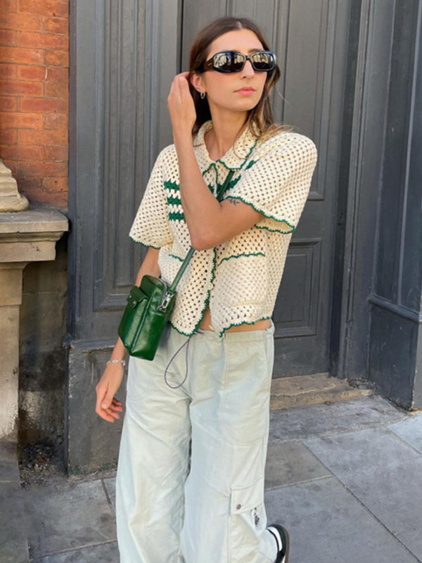 Flag Polo Yaka Çizgili Delikli Kısa Kollu Üst
