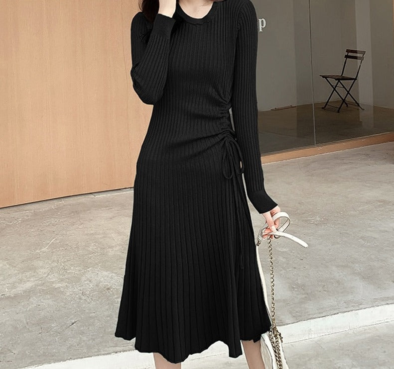 A Kesim Bel Büzgülü Triko Midi Elbise