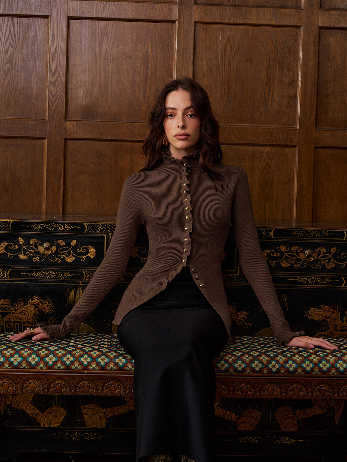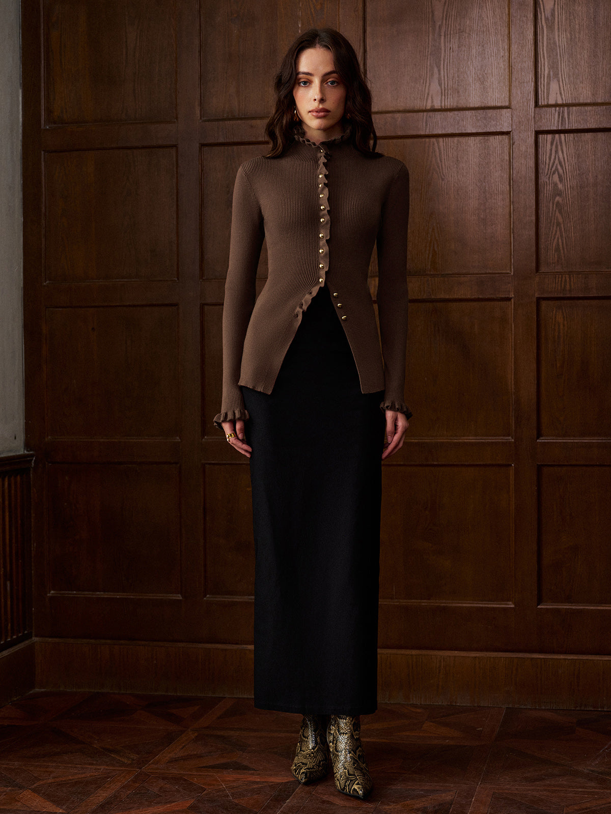 Marul Kenarlı Metal Düğmeli Yırtıklı Kardigan