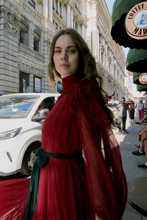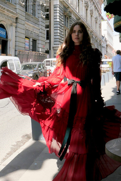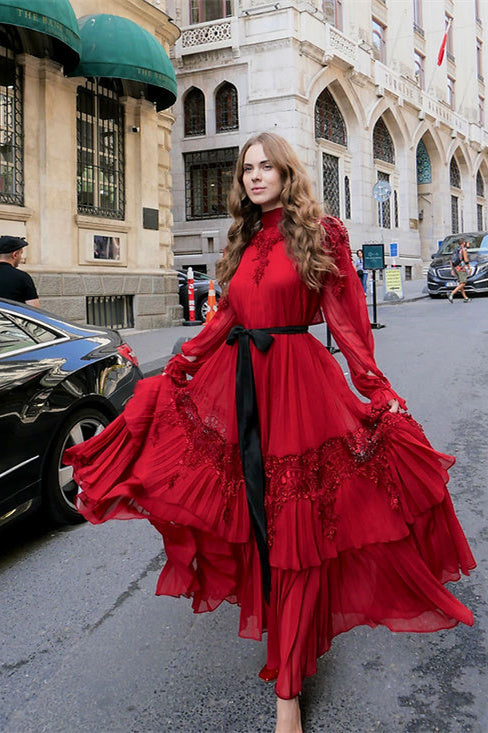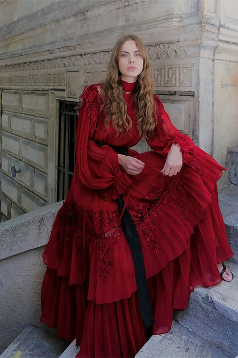 Sylvia Dantelli Katlı Şifon Maxi Elbise