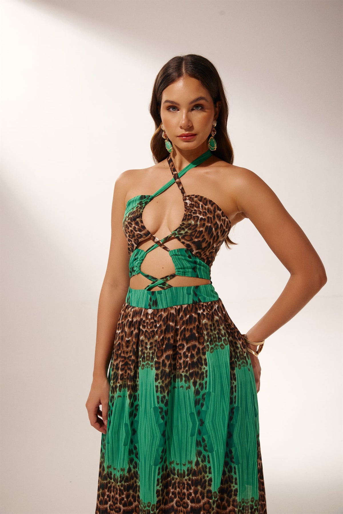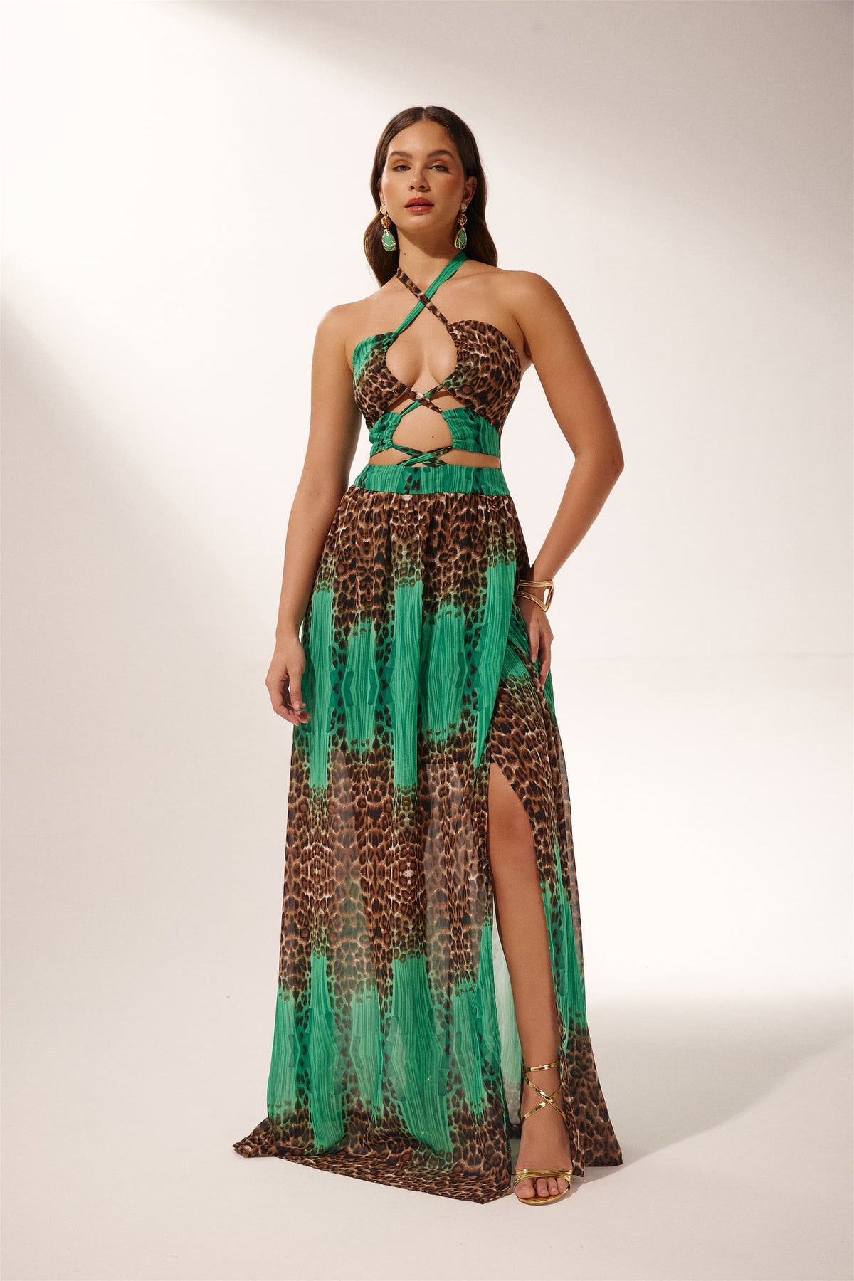 Virginia Boyundan Bağlı Leopar Baskılı Uzun Elbise