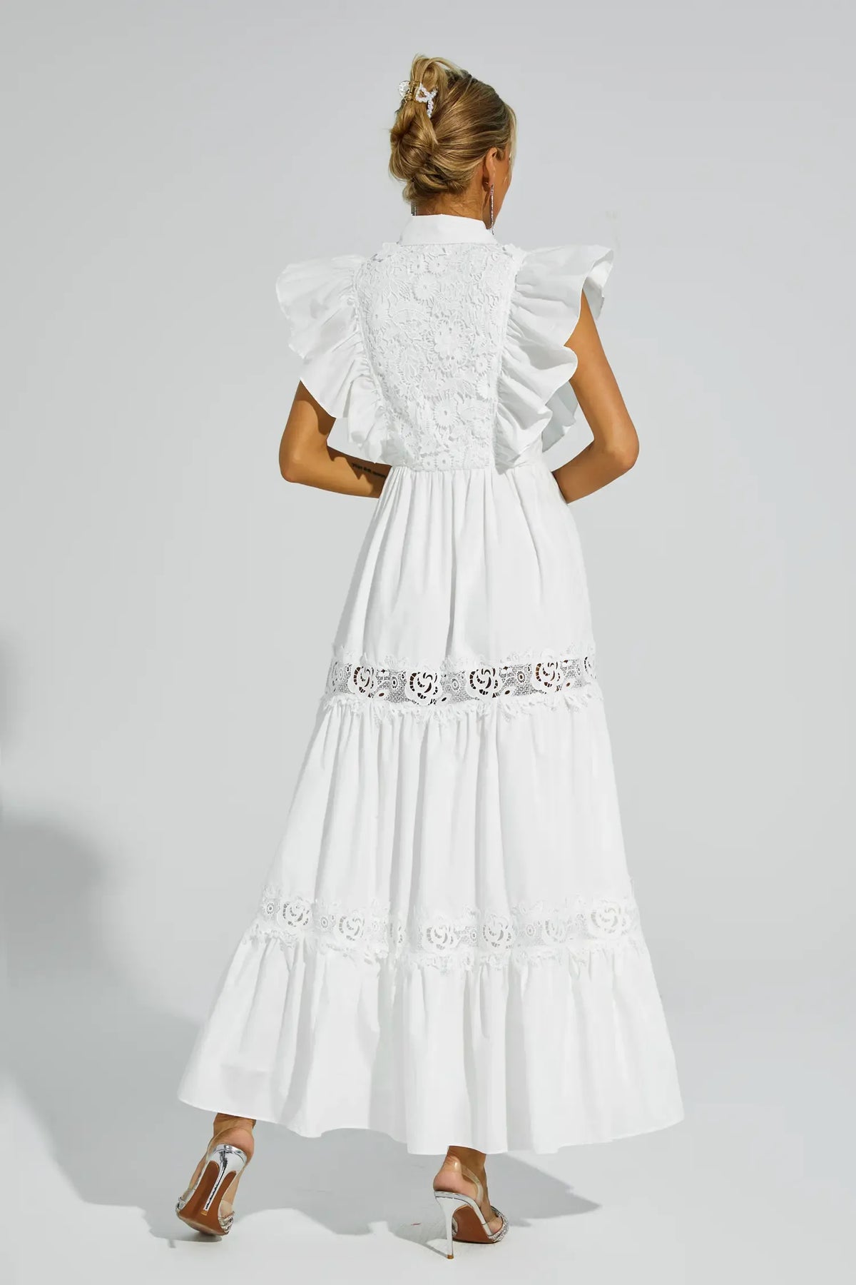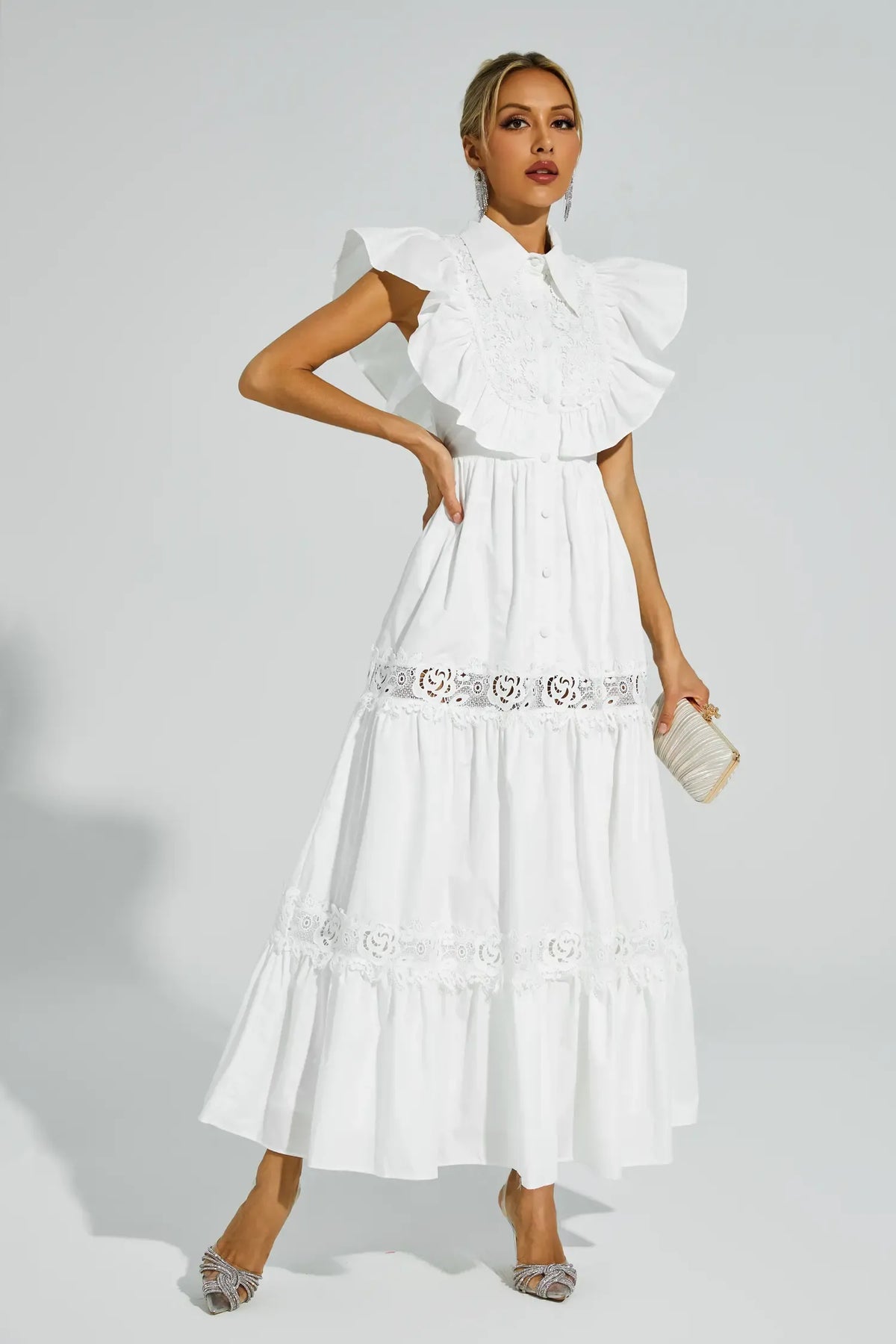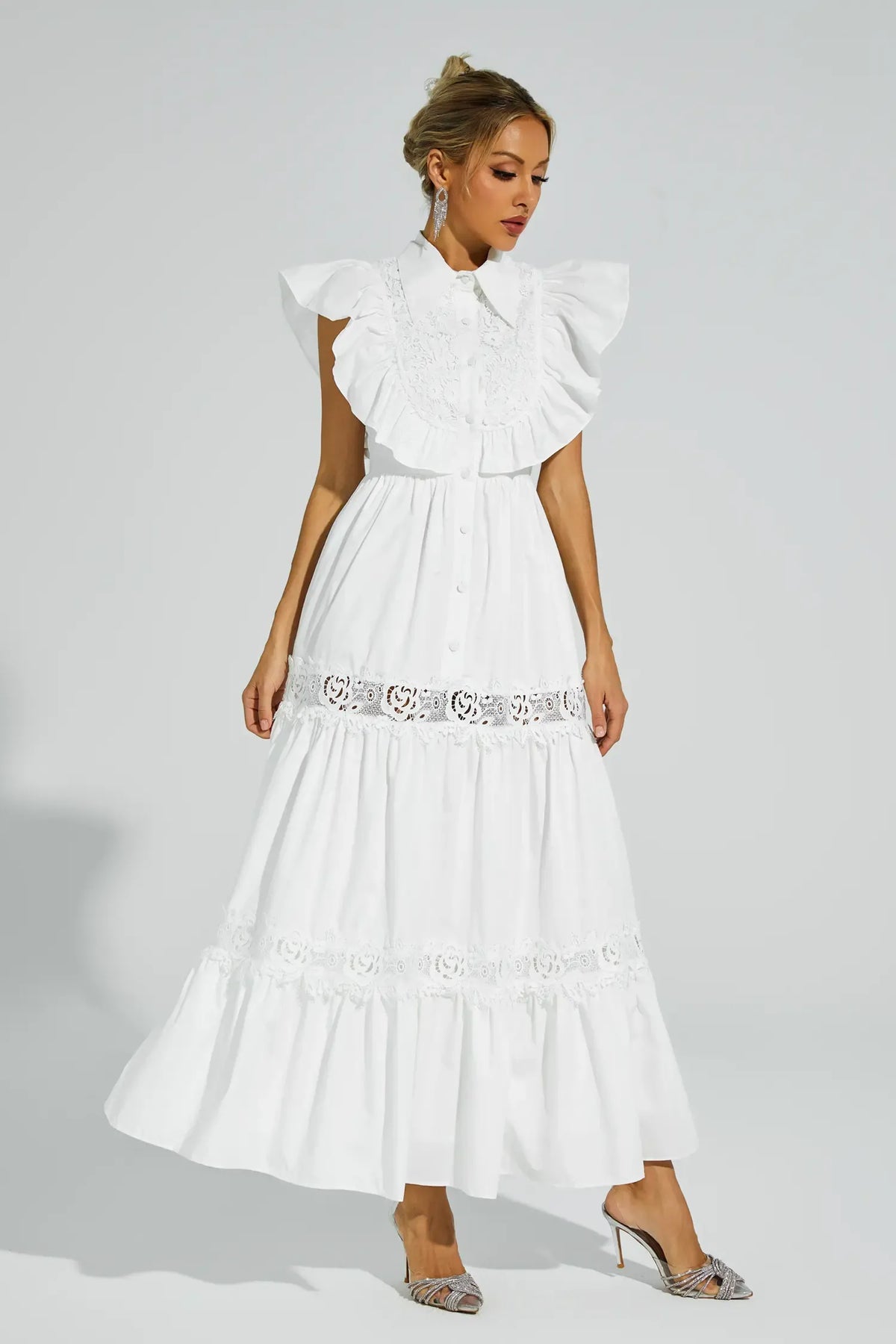 Wesley Beyaz Kolsuz Fırfırlı Maxi Elbise