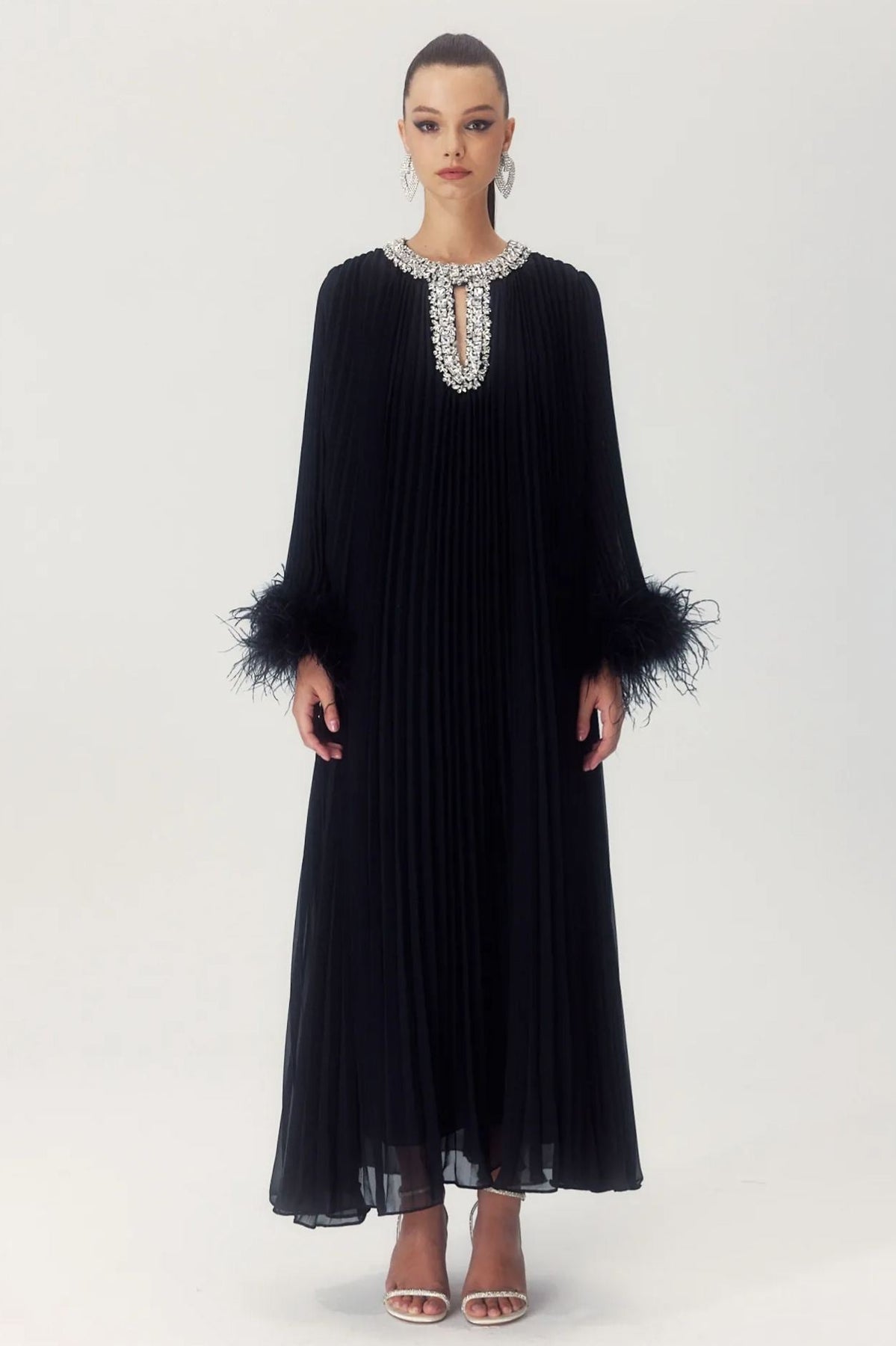Yvonne Diamante Tüylü Pileli Maxi Şifon Elbise
