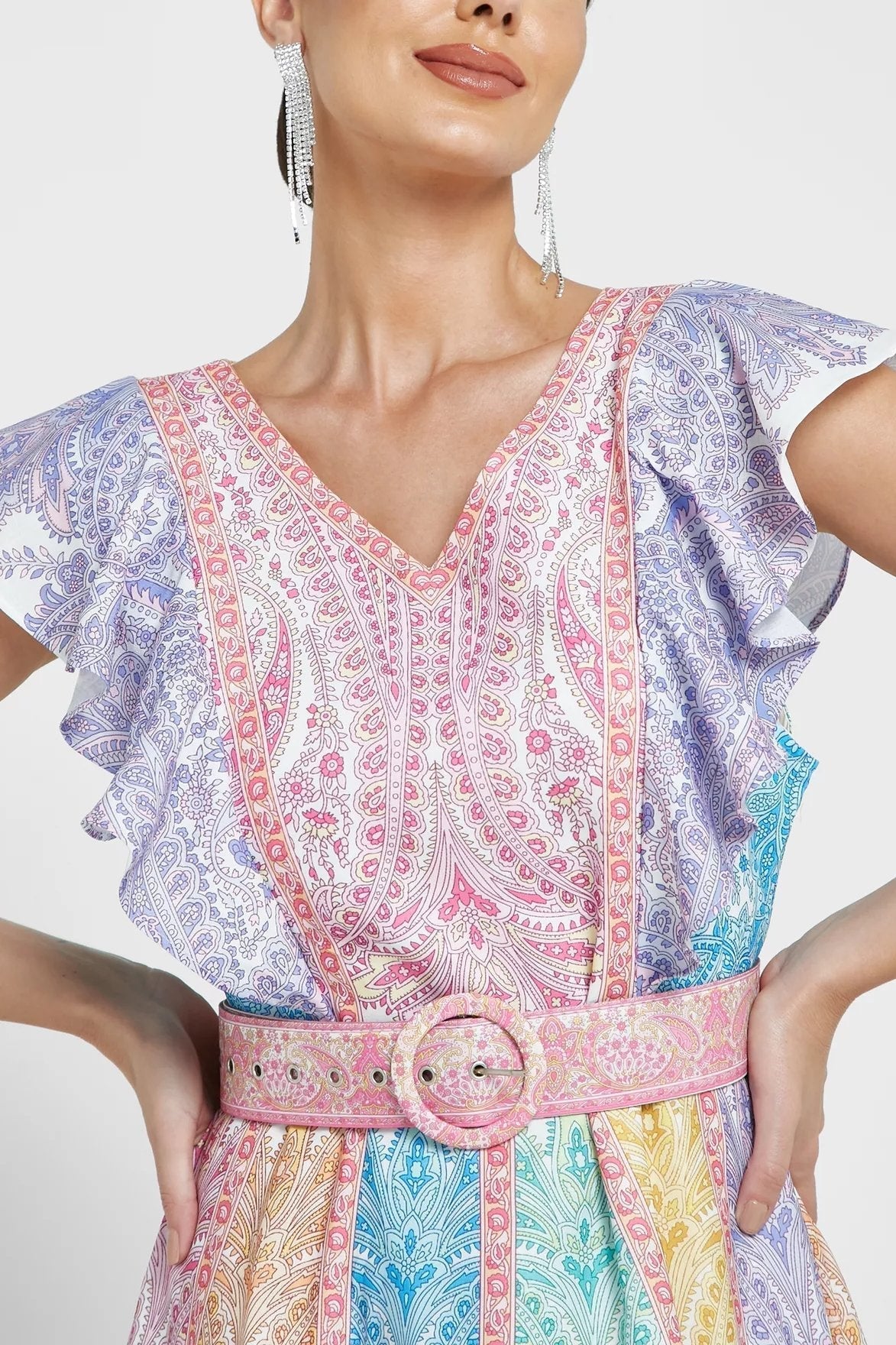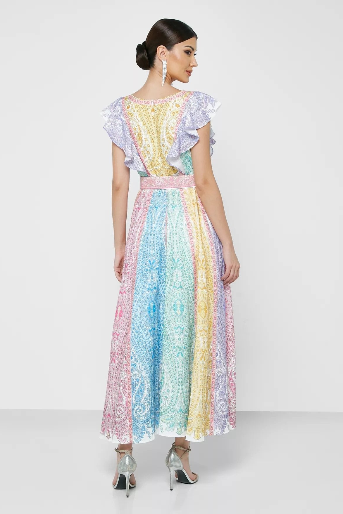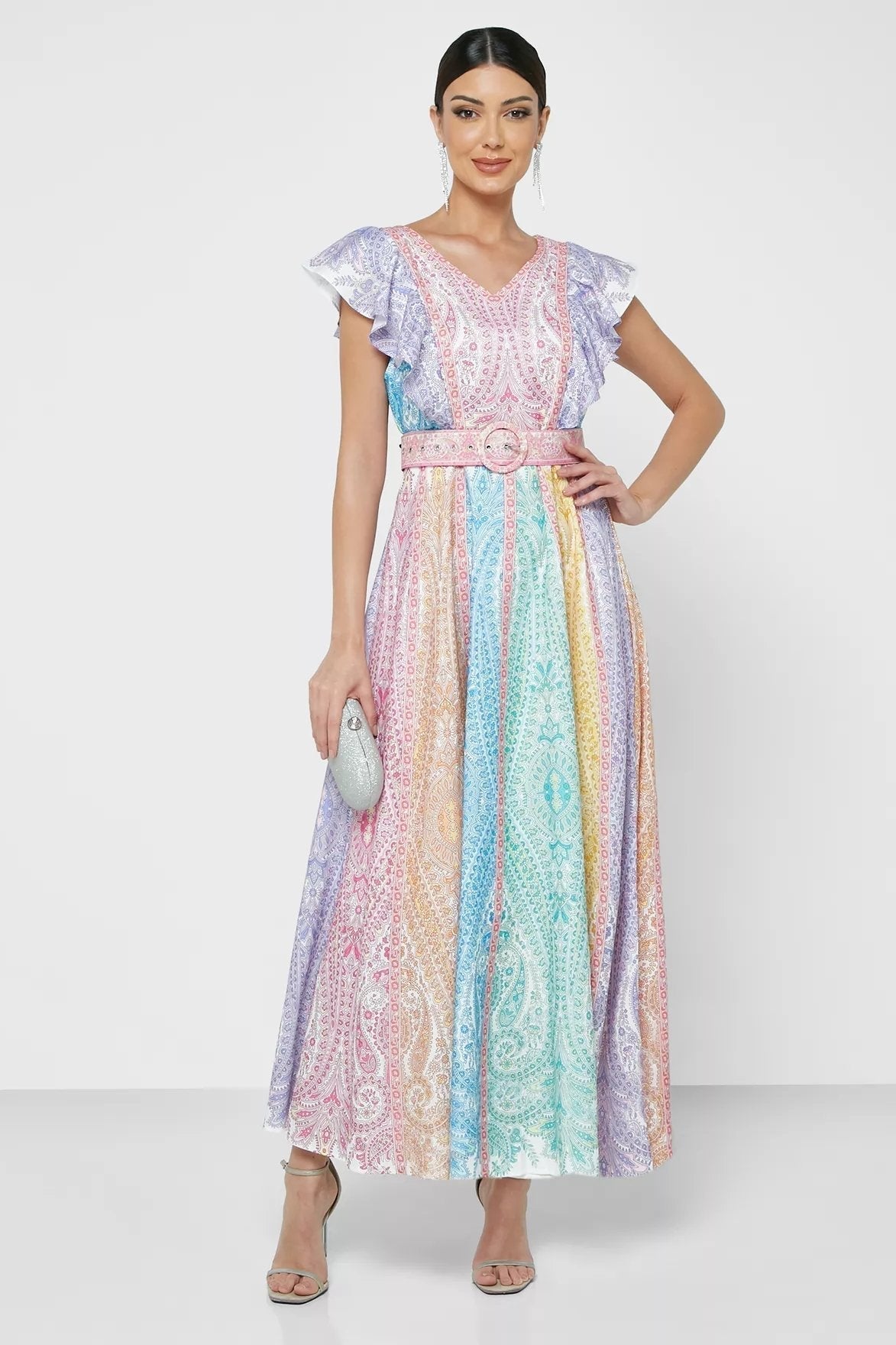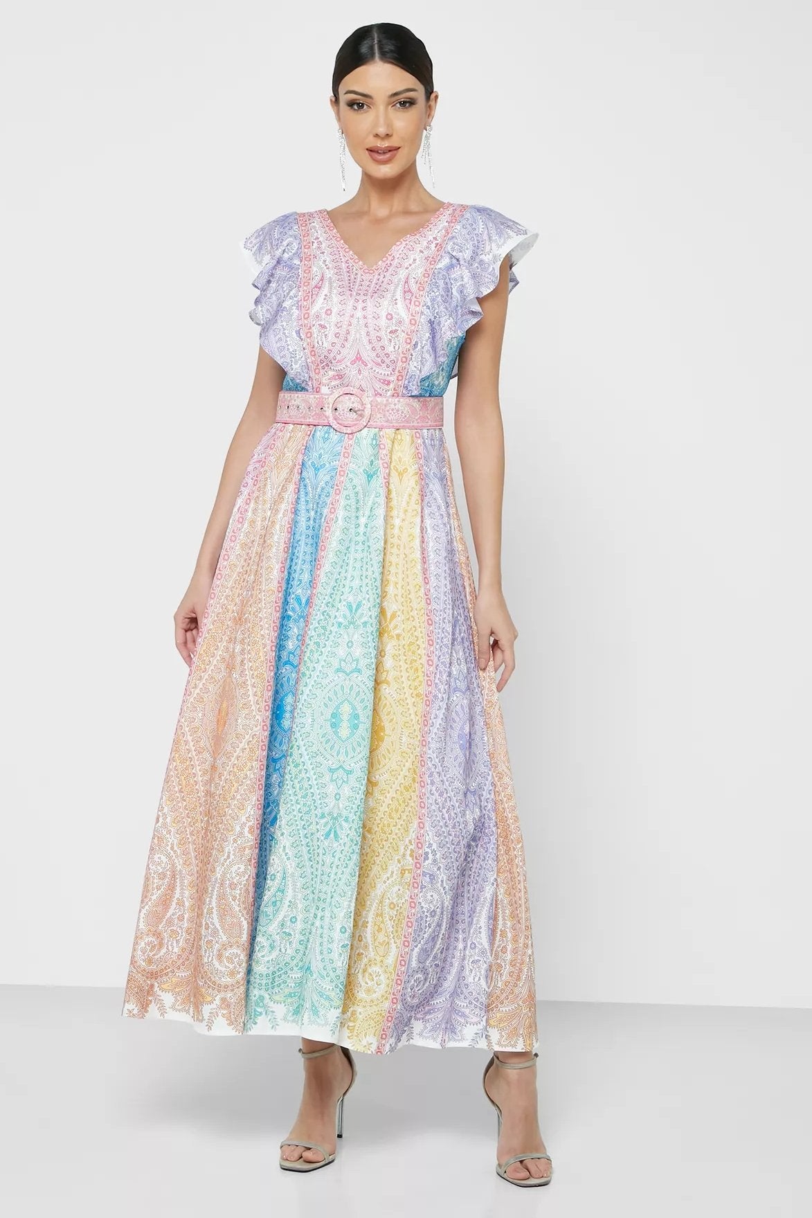 Zanna Baskılı Fırfırlı V Yaka Kemerli Uzun Elbise